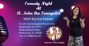 Catholic writer and comedienne Karina Fabian applies her talents to what she loves the most. Her performances exude the joy as well as the humor of the many wonderful facets of the Catholic faith. As such, she’s entertained local and national audiences in parishes and conferences. Other topics she loves are Florida, the writer’s life, getting old, and memory issues.